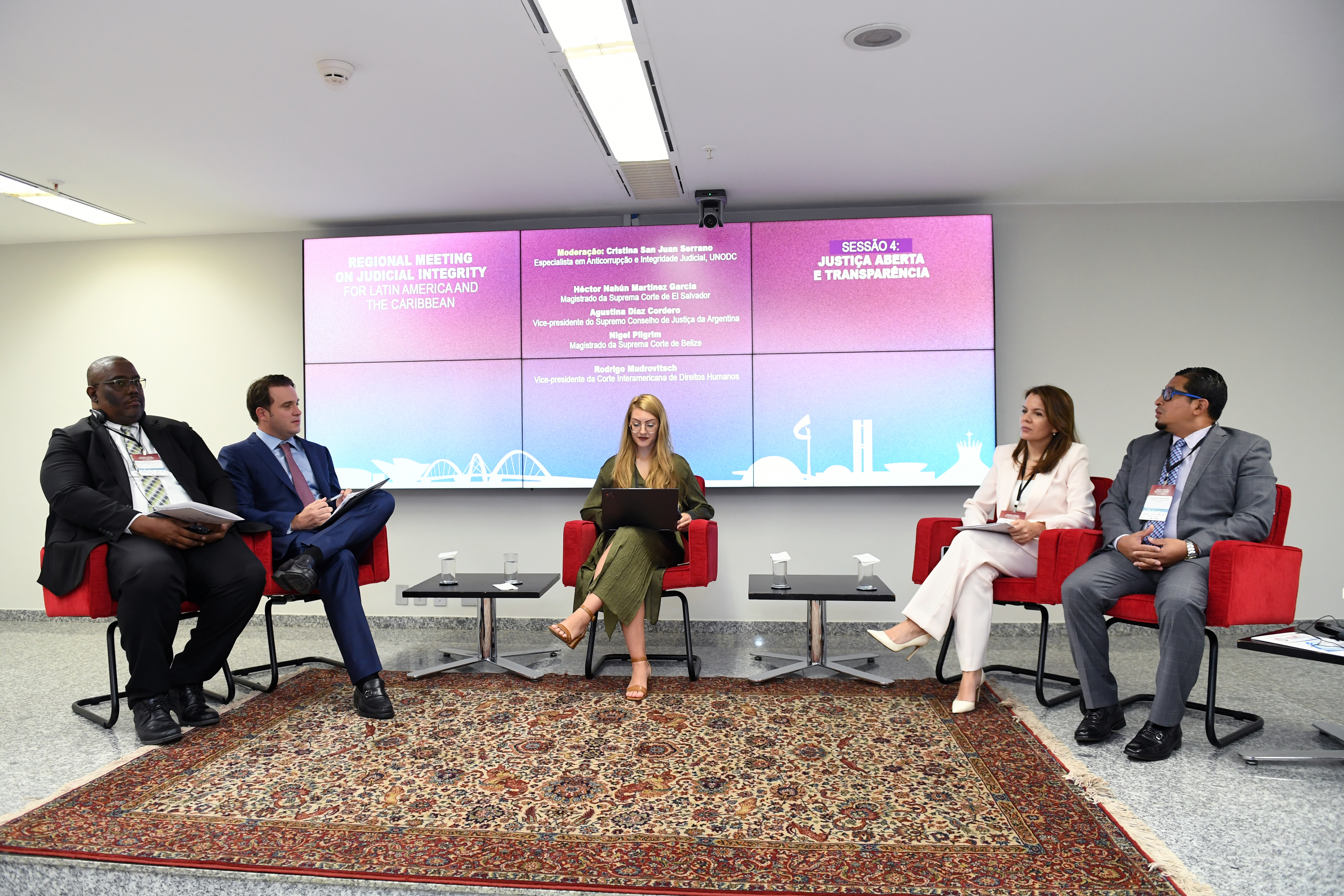 En el segundo encuentro, tuve el honor de formar parte del panel de la Sesión N° 4 sobre "Justicia abierta y transparencia judicial", junto al Hon. Rodrigo Murdovich, Vicepresidente de la Corte Interamericana de Derechos Humanos; el Hon. Héctor Nahún Martínez García, Magistrado de la Corte Suprema de Justicia de El Salvador; y el Hon. Nigel Pilgrim, Magistrado de la Corte Suprema de Justicia de Belice.